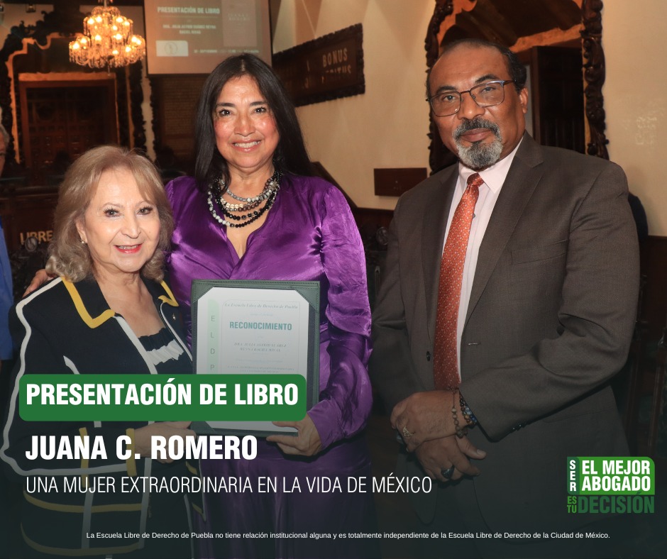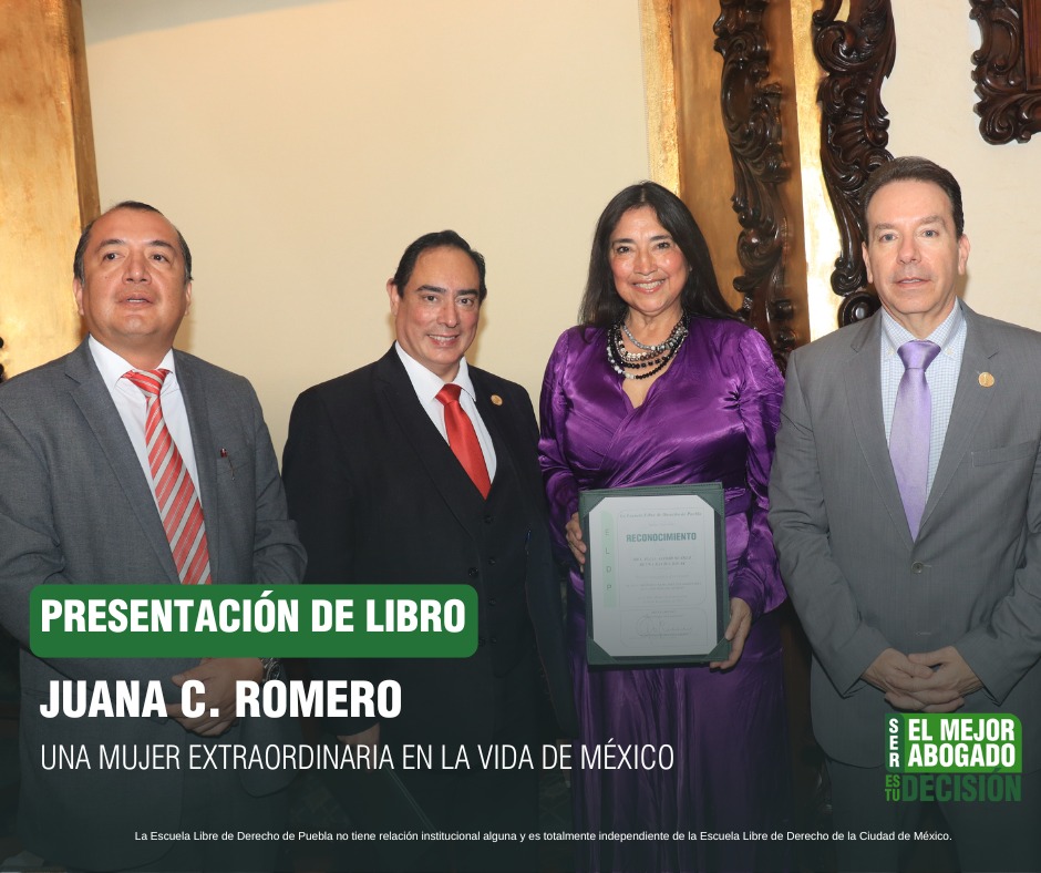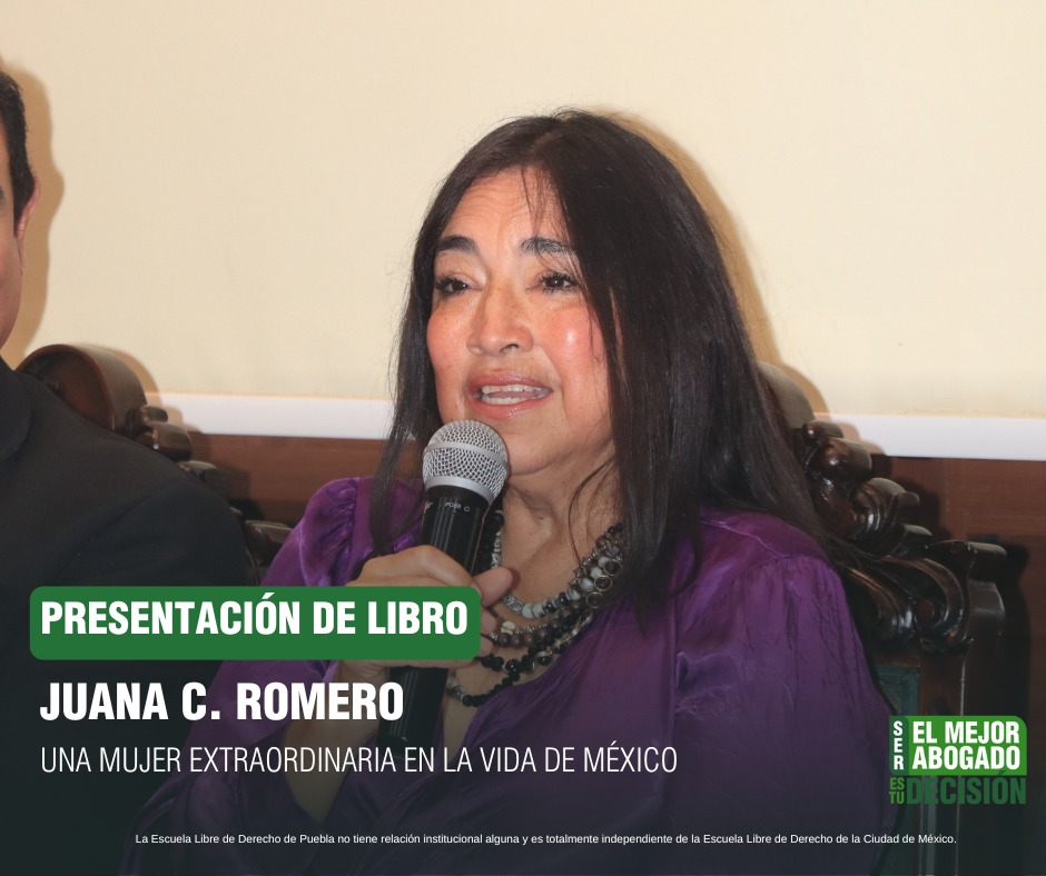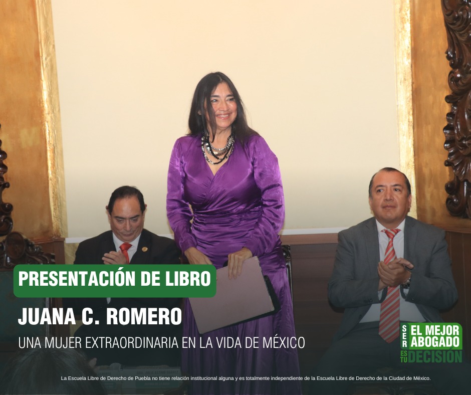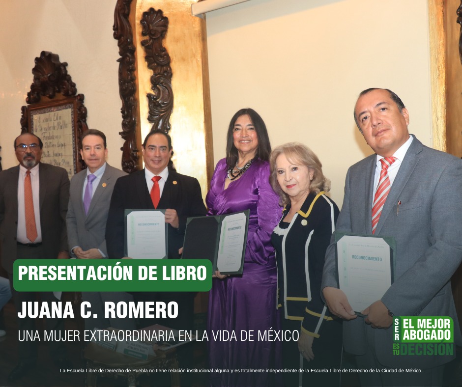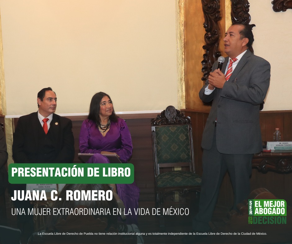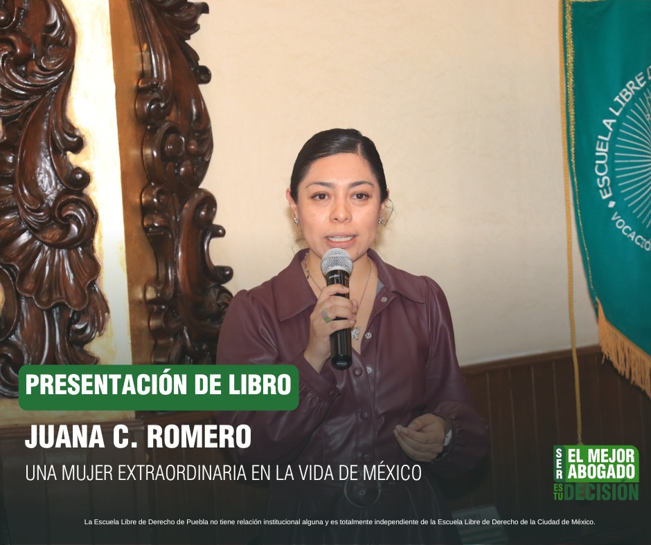 En el Aula Magna de la Escuela Libre de Derecho de Puebla, se llevó a cabo la presentación del libro “Juana C. Romero: Una mujer extraordinaria en la vida de México”, escrito por la Dra. Julia Astrid Reyna Raciel Rivas. Un homenaje literario a una mujer que dejó huella en la historia nacional.